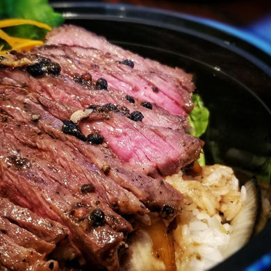 Rib eye beef marinated and aged with a homemade sauce stir fried with onion on top of sesame served with Jasmine rice